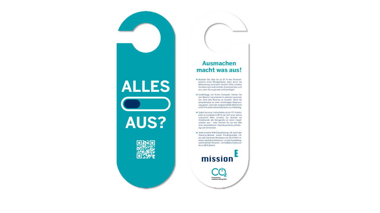 Wissenschaftliche Studien und langjährige Projekterfahrungen zeigen: Meist sind Gewohnheiten die Ursache für die Energieverschwendung. Darum können Sie die Beschäftigten sehr gut zum Beispiel mit diesem auffälligen Türklinkenhänger für energiebewusstes Verhalten sensibilisieren. Dieser freundliche „Reminder“ ist für die Türklinken der dienstlichen Büros gedacht: Er erinnert die Kolleginnen und Kollegen beim Verlassen ihrer Büros (etwa vor der Mittagspause oder zum Feierabend) unaufdringlich an das Ausschalten der nicht benötigten Stromverbraucher. Und auf der Rückseite des Türklinkenhängers finden sich kurze, mit konkreten Zahlen hinterlegte Energiespartipps.