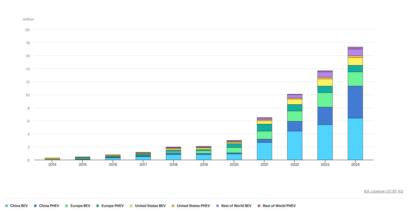 Diagramm „Global electric car sales 2014-2024“ der Internationalen Energieagentur (IEA) vom 01.04.2025 -