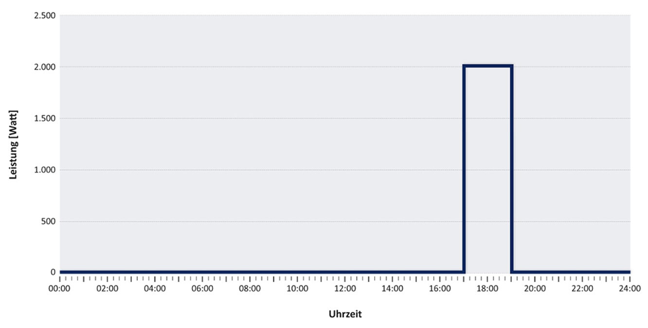 Diesem Grundprinzip folgend, zeigt Abbildung 1 den Tageslastgang des Staubsaugers aus unserem einführenden Gedankenspiel: So lange der Sauger im Schrank steht (bis 17 Uhr), beträgt seine Leistungsaufnahme 0 Watt (W). In dem Augenblick, in dem Sie ihn einschalten, schnellt die Leistungsaufnahme hoch auf 2.000 W. Auf diesem Niveau bleibt sie, solange Sie die Wohnung saugen, das heißt bis der Staubsauger um Punkt 19 Uhr wieder ausgeschaltet wird: In diesem Moment fällt die Leistung wieder auf 0 Watt, und so lange der Sauger im Schrank steht und nicht in Betrieb ist, ändert sich daran nichts.
