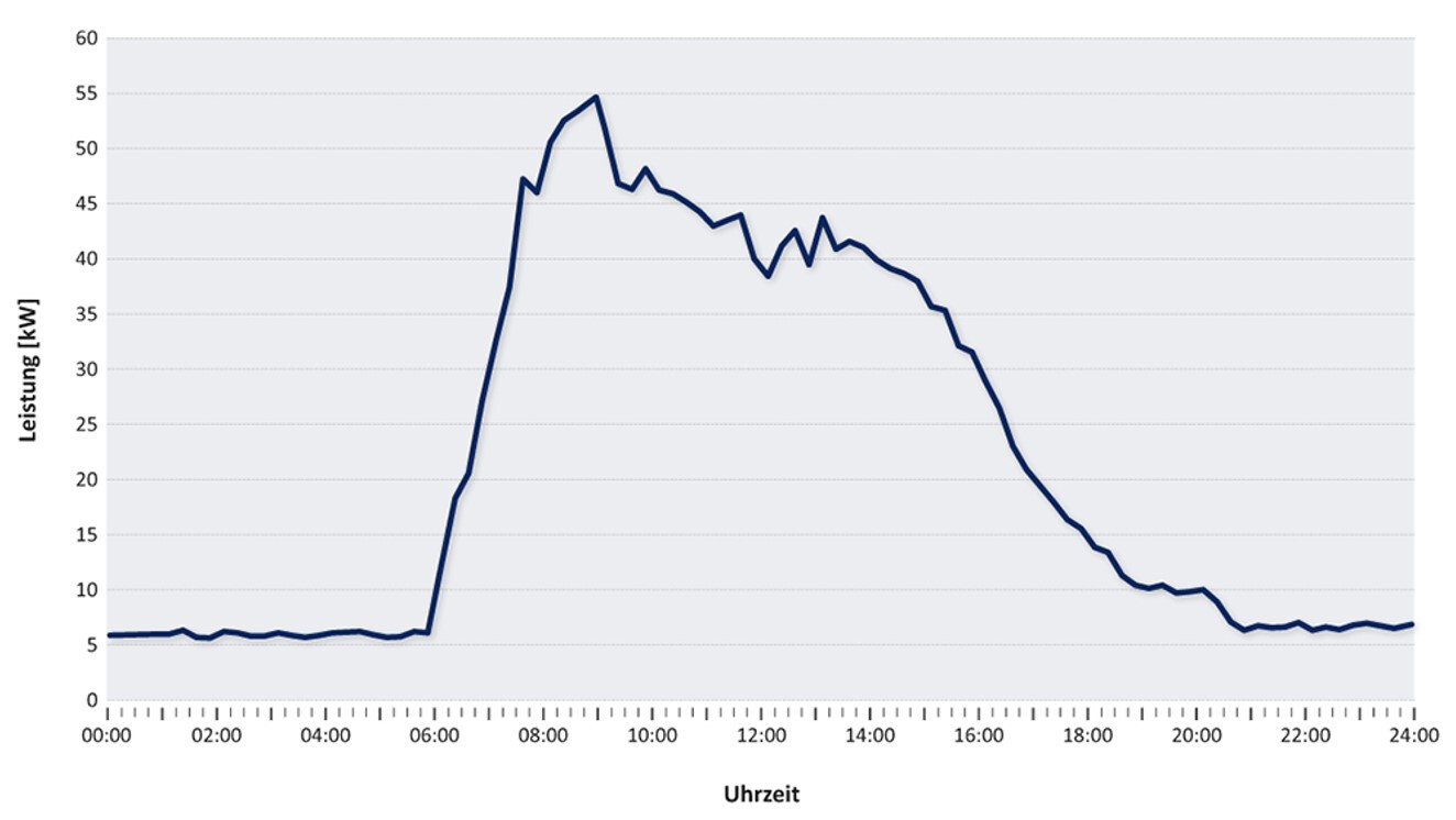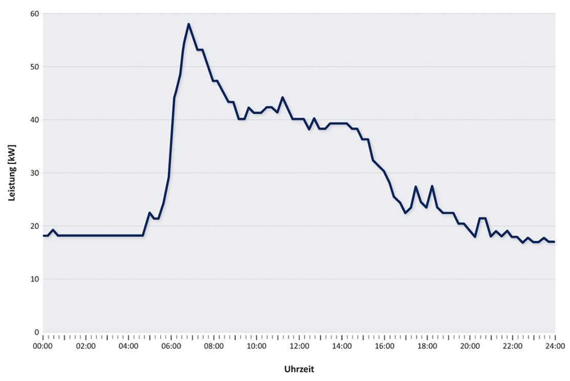 In Abbildung 2 ist ein exemplarischer Tageslastgang eines Bürogebäudes mit rund 300 Beschäftigten dargestellt.