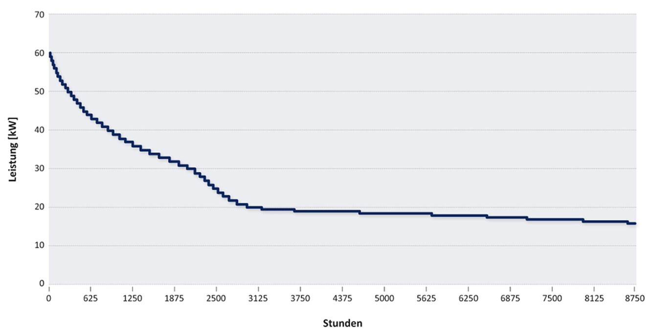 Präziser wird die Berechnung, wenn man sie nicht auf der Grundlage eines Tageslastgangs, sondern auf Basis einer „Jahresdauerlinie“ durchführt. Die Jahresdauerlinie ist vom Prinzip her ein Jahreslastgang, der die Werte der ganzjährigen Viertelstundenmessung nicht chronologisch zeigt, sondern absteigend von links nach rechts; die Skalierung der x-Achse gibt das Jahr deshalb nicht in kalendarischer Form wieder (vom 1. Januar, 0 Uhr bis 31. Dezember, 24 Uhr), sondern in Form von 365 x 96 = 35.040 Viertelstunden bzw. 8.760 Stunden (vgl. Abbildung 7).
