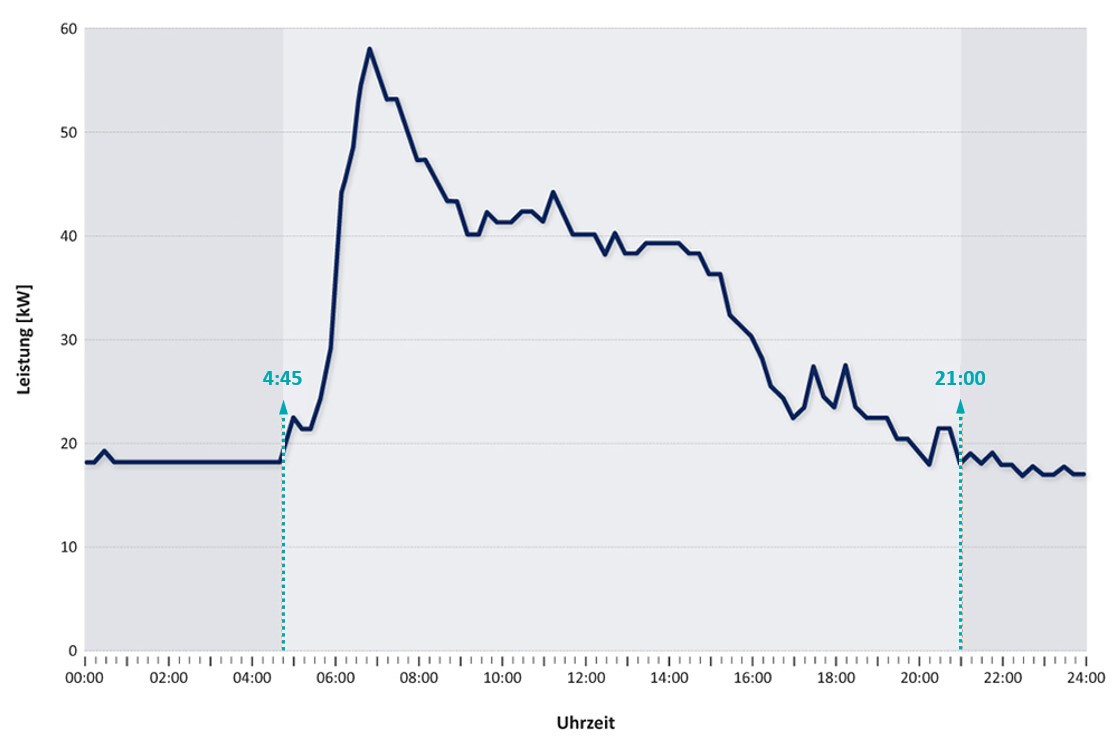 Von Mitternacht bis 4.45 Uhr verläuft die Linie der Leistungsaufnahme konstant bei etwa 18 kW; der Grund für die Leistungsaufnahme des Bürogebäudes in diesen Stunden können zum Beispiel Serverräume, Heizungspumpen oder auch Bürogeräte im Standby- oder Scheinaus-Betrieb sein.