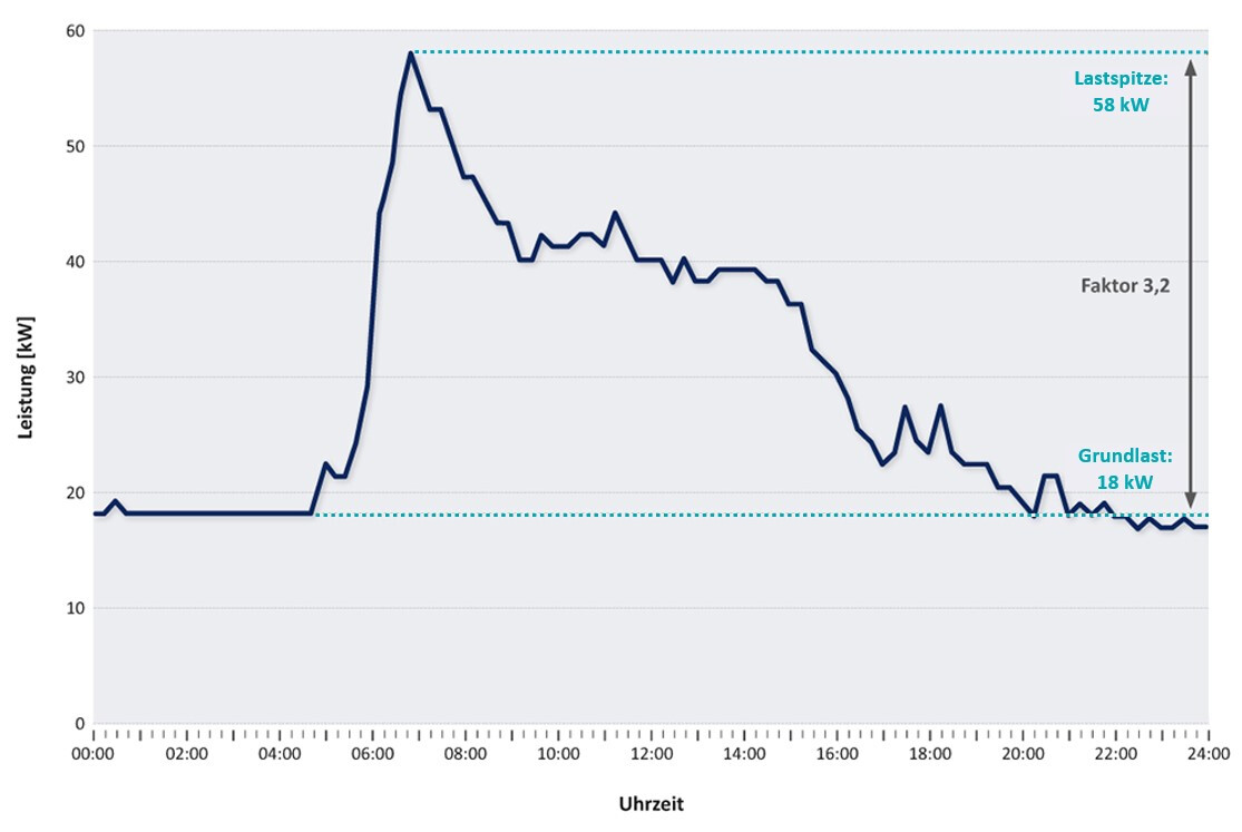 Als Grundlast wird die Leistungsaufnahme des Gebäudes bezeichnet, die auch außerhalb des täglichen Bürobetriebs anfällt, also rund um die Uhr – auch nachts und an den Wochenenden sowie an Feiertagen. Bei dem beispielhaften Bürogebäude, dessen Tageslastgang wir bereits in Abbildung 2 kennengelernt haben, beträgt die Grundlast etwa 18 kW. Als Lastspitze bezeichnet man den Wert der höchsten Leistungsaufnahme im betrachteten Zeitraum; bei dem Tageslastgang in Abbildung 2 ist die Lastspitze um 6.45 Uhr zu verzeichnen, sie beläuft sich auf 58 kW. Demnach beträgt das Verhältnis von Lastspitze und Grundlast in diesem Fall 3,2 (vgl. Abbildung 3).