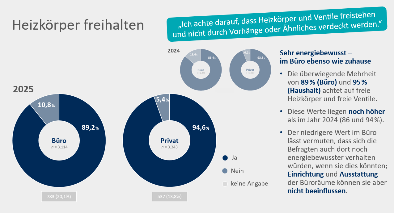 Wie konsistent das dienstliche und private Verhalten der Befragten überwiegend ist, zeigt zum Beispiel die Zustimmung zu der Aussage „Ich achte darauf, dass Heizkörper und Ventile freistehen und nicht durch Vorhänge oder Ähnliches verdeckt werden“: Mit 89 % bzw. 95 % der Befragten beherzigt wie schon im Vorjahr sowohl im Büro als auch zuhause eine ähnlich große Mehrheit diesen Energiespartipp. (Der Unterschied zwischen Büro und Haushalt könnte darauf zurückzuführen sein, dass die Befragten im Büro weniger Einfluss auf die Einrichtung und Ausstattung ihres Arbeitsplatzes haben.)