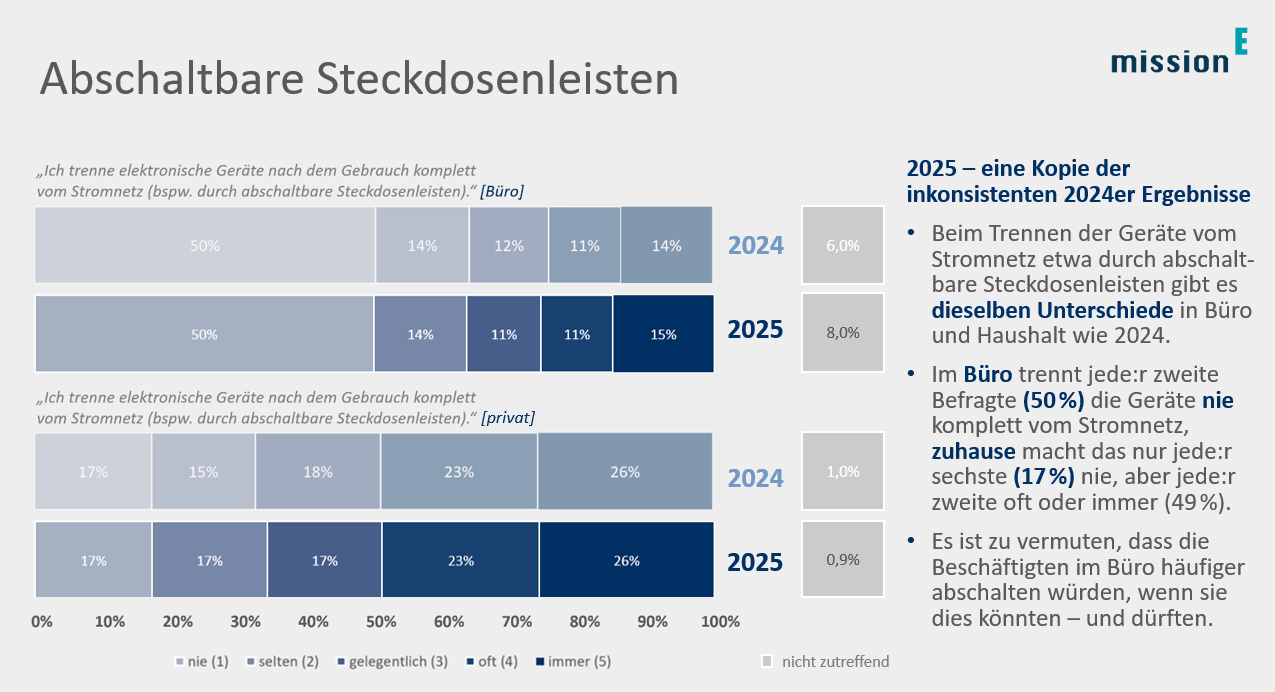 Das Trennen elektronischer Geräte vom Stromnetz nach dem Gebrauch (etwa mithilfe einer abschaltbaren Steckdosenleiste) ist ein Beispiel für Abweichungen zwischen dem dienstlichen und privaten Verhalten: Im Büro trennen 50 % der Befragten die Geräte nie komplett vom Stromnetz, zuhause dagegen machen das nur 17 % niemals. Andere Einzelbefunde lassen die These plausibel erscheinen, dass die Befragten die Bürogeräte am Arbeitsplatz häufiger vom Stromnetz trennen würden (etwa vor dem Feierabend), wenn sie dies könnten oder dürften. Das hier schlummernde Stromsparpotenzial ist also eher eines, das durch die technische Ausstattung oder energiebewusstere IT-Vorgaben gehoben werden könnte.