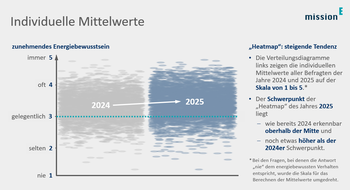 Was nach staubtrockener Statistik klingt, war für uns die spannendste Auswertung überhaupt. Denn erst die Mittelwerte erlauben einen übergeordneten Blick. Die im Einzelfall beantworteten Fragen sind die Basis der individuellen Mittelwerte, die das folgende Verteilungsdiagramm zeigt – von allen rund 7.000 Befragten 2024 und 2025. Es ist gut zu erkennen, dass der Schwerpunkt der 2025er „Heatmap“ noch etwas deutlicher als im Vorjahr oberhalb der Mitte liegt und dem Wert 4 („oft“) sehr viel näher ist als dem Wert 2 („selten“).