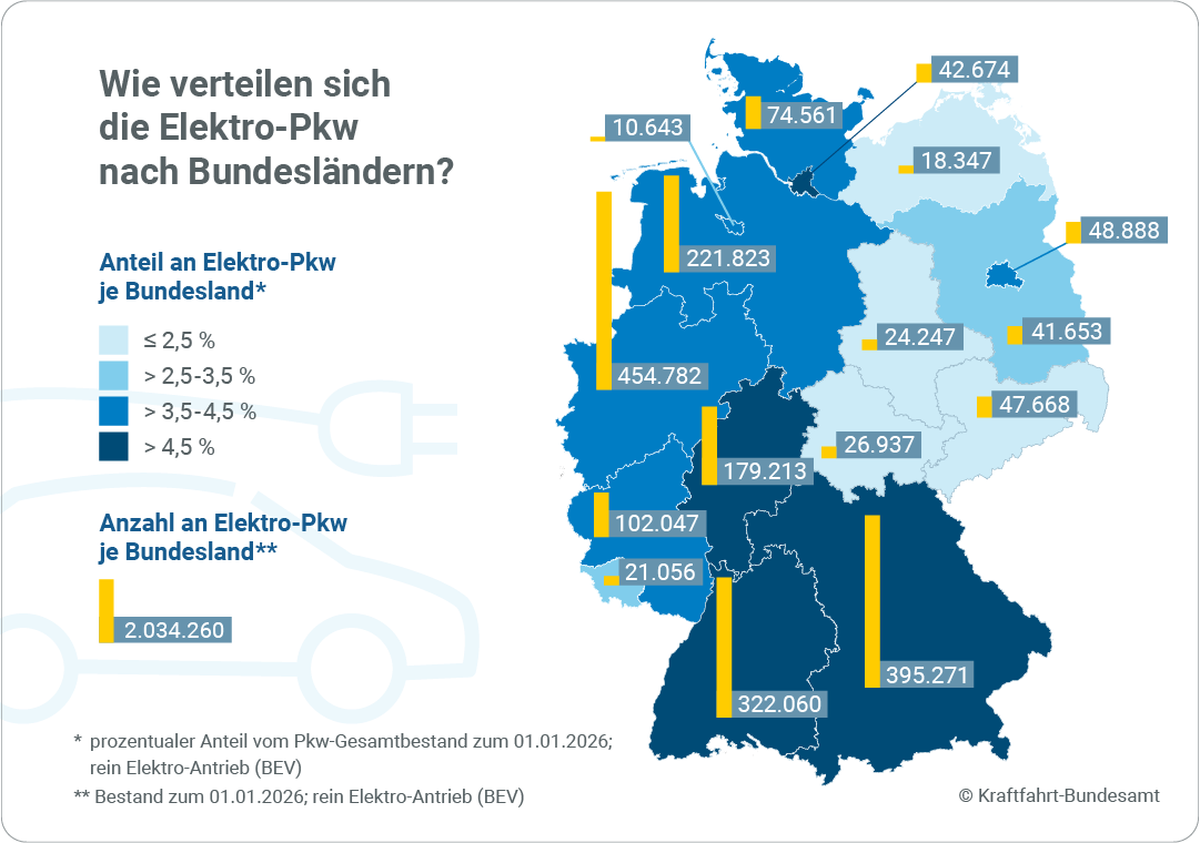 In den drei Stadtstaaten kommen die reinen Elektrofahrzeuge auf einen Anteil von 5,3 % (Hamburg), 4 % (Berlin) bzw. 3,5 % (Bremen). In den östlichen Bundesländern Sachsen, Sachsen‑Anhalt, Thüringen, Brandenburg und Mecklenburg‑Vorpommern wiederum liegt der Anteil zwischen 2 und 2,3 %.