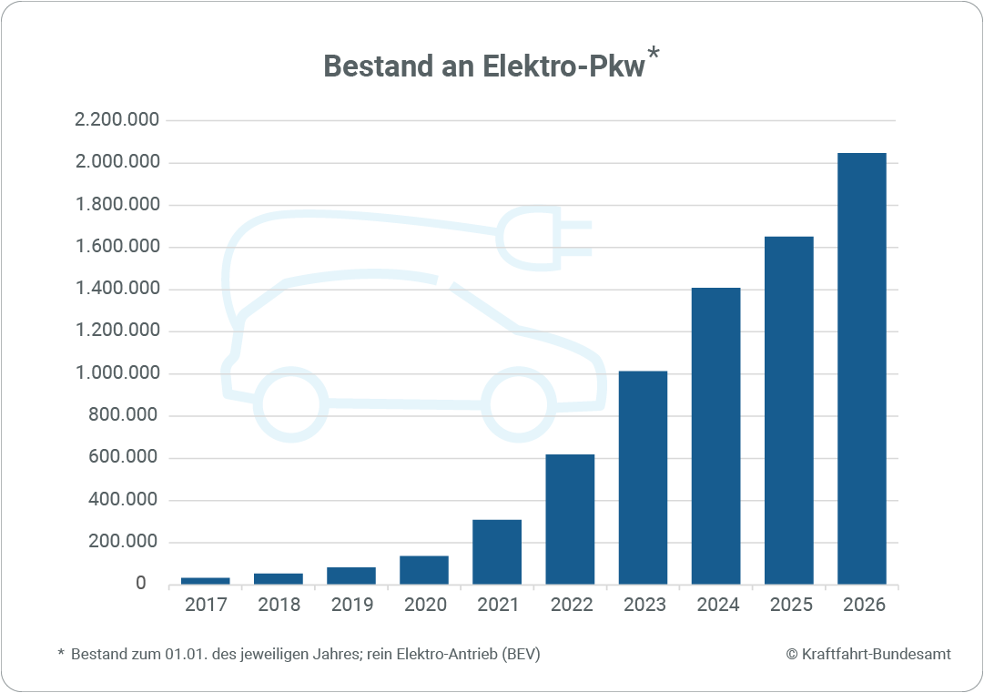 Die Entwicklung des Elektrofahrzeugbestandes zeigt laut KBA-Statistik ein kontinuierliches Wachstum: Während im Jahr 2017 noch 34.022 Fahrzeuge zugelassen waren, hat sich die Zahl bis 2026 auf über zwei Millionen Fahrzeuge erhöht – das entspricht einer Steigerung auf das 60-Fache innerhalb von neun Jahren. Ein besonders starkes Wachstum ist seit 2020 zu beobachten, und im Jahr 2023 wurde erstmals die 1-Million-Marke überschritten.
