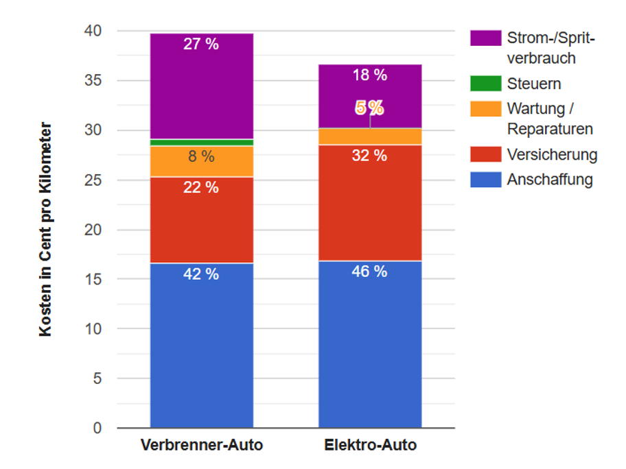 - Ein Diagramm mit zwei Balken zeigt die Gesamtkosten über das Fahrzeugleben für den Verbrenner und das Elektroauto in der Einheit „Cent pro Kilometer“. Jeder Balken setzt sich aus vier bis fünf verschiedenfarbigen Teilen zusammen, die für die Prozentanteile der einzelnen Positionen der Gesamtrechnung stehen (Anschaffungskosten, Strom- bzw. Spritverbrauch usw.).