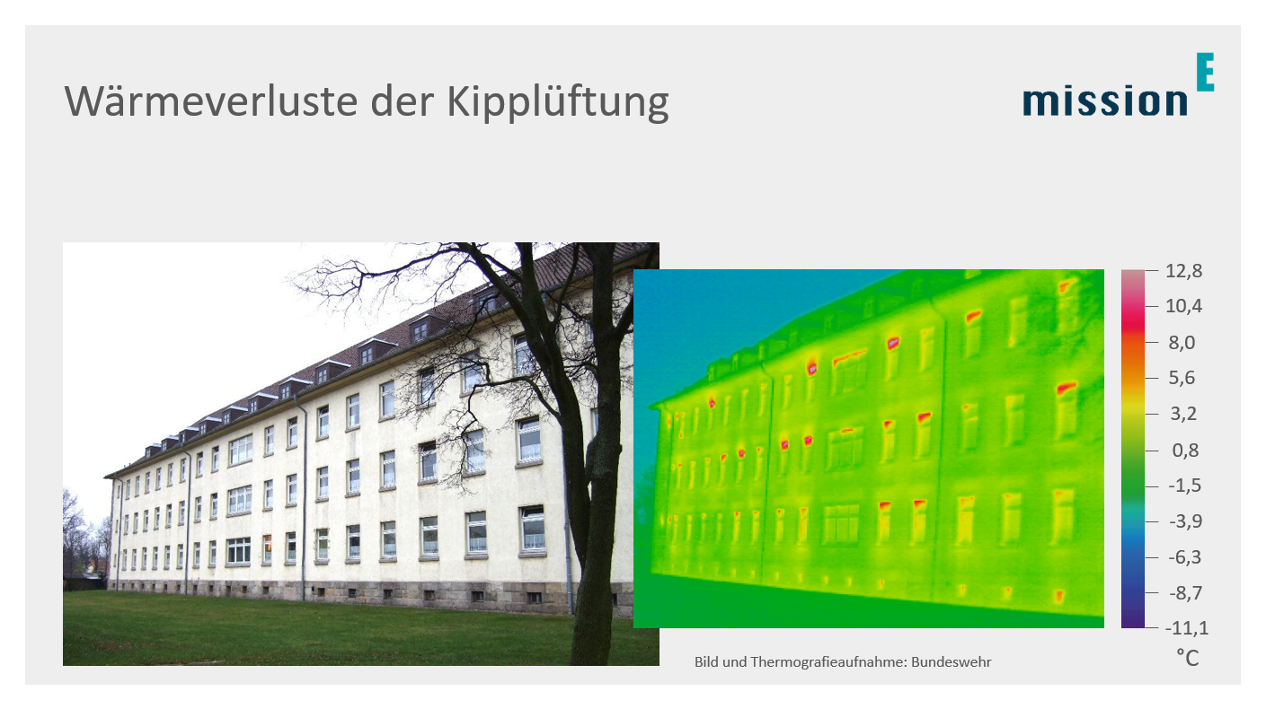 In der Heizperiode sollte immer die Quer- oder Stoßlüftung Ihre erste Wahl sein: Hier reichen 3- bis 4-mal täglich 2 Minuten (bei der Querlüftung) bzw. 5-10 Minuten (bei der Stoßlüftung) aus, um die Raumluft auszutauschen. Zum einen dauert es bei der Kipplüftung mit 30 Minuten um ein Vielfaches länger, bis die verbrauchte Luft gegen frische Luft ausgetauscht ist. Zum anderen kühlen Wände und Mobiliar beim kurzen, kräftigen Lüften nicht aus und müssen daher auch nicht mit hohem Energieaufwand wieder aufgeheizt werden – anders als bei der permanenten Lüftung „auf Kipp“ (weitere Infos hierzu finden Sie auf der Seite „Richtig lüften“). Es lässt sich nicht allgemein sagen, wie hoch die Energieersparnis der Quer- oder Stoßlüftung ist. Allerdings illustrieren Wärmebilder von Gebäuden mit Fenstern auf Kipp die resultierenden Wärmeverluste sehr deutlich (vgl. das Bild zum Herunterladen unten auf der Seite).