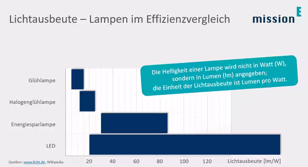 Die Helligkeit einer Lampe wird nicht durch ihre Watt-Zahl, sondern durch ihren Lumen-Wert angegeben („lm“), der auf der Lampenverpackung angegeben ist und den Lichtstrom einer Lampe beziffert. Der Gradmesser für die Energieeffizienz einer Lampe wiederum ist ihre Lichtausbeute, die in Lumen pro Watt („lm/W“) angegeben wird: Energieeffiziente Lampen erzeugen genau so viel Licht wie die ineffizienten (Halogen-) Glühlampen, allerdings bei einer deutlich geringeren Watt-Zahl – und einer besseren Lichtausbeute.