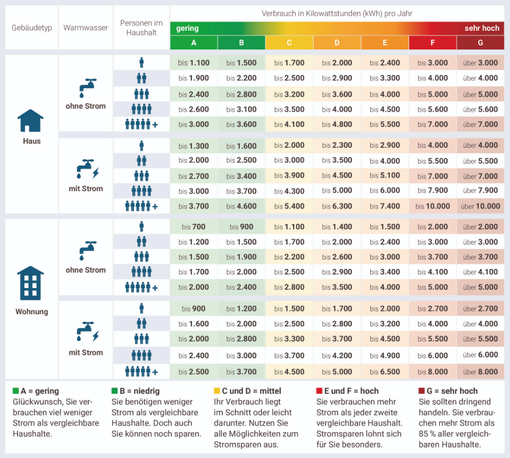 Mithilfe des Stromspiegels für Deutschland kann jeder Privathaushalt seinen jährlichen Stromverbrauch in eine von insgesamt sieben Effizienzklassen einordnen – auf einer Skala, wie man sie von Elektrogeräten und Lampen kennt: von A (grün) für einen sehr niedrigen Verbrauch bis G (rot) für einen sehr hohen Verbrauch. Der Stromspiegel berücksichtigt sogar die individuelle Wohnsituation, denn je nach Anzahl der im Haushalt lebenden Personen, Gebäudetyp und Art der Warmwasserbereitung bietet er unterschiedliche Vergleichswerte.