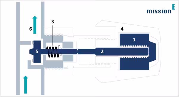 Nehmen wir an, das Thermostatventil wurde auf die Temperaturstufe 3 eingestellt – das entspricht ungefähr 20 bis 21 °C. Sinkt die Raumtemperatur unter diesen voreingestellten Wert, zieht sich das Ausdehnungselement (1) zusammen. Daraufhin wird der Übertragungsstift (2) durch die Rückstellfeder (3) in den Ventilkopf (4) gedrückt, und das Ventil (5) öffnet – warmes Wasser (6) fließt in den Heizkörper. Je höher aufgrund dessen die Raumtemperatur ansteigt, desto mehr dehnt sich das Ausdehnungselement wieder aus, desto weiter wird der Übertragungsstift aus dem Ventilkopf gedrückt, und desto weiter wird wiederum das Ventil geschlossen. Kühlt der Raum nach einiger Zeit wieder ab, beginnt das gleiche Spiel von vorn.